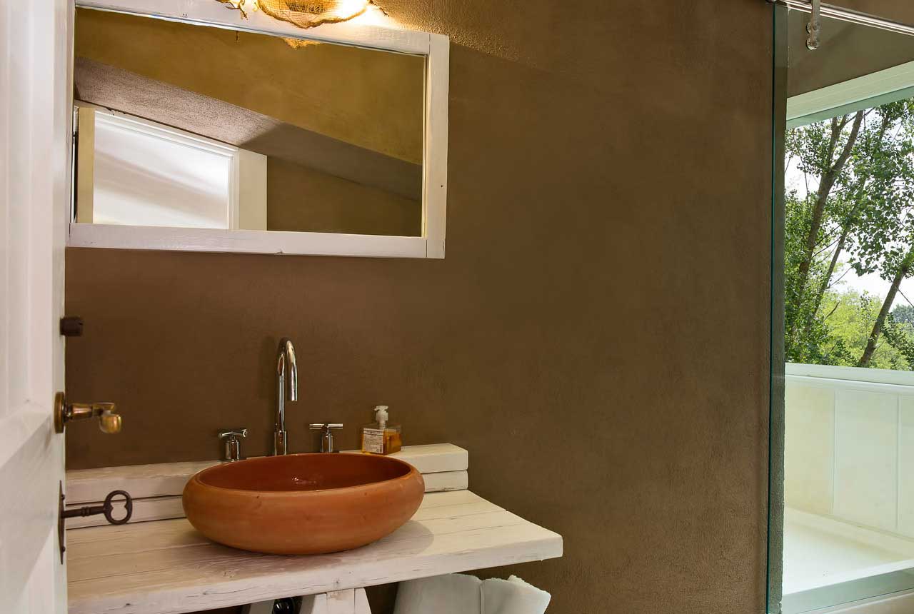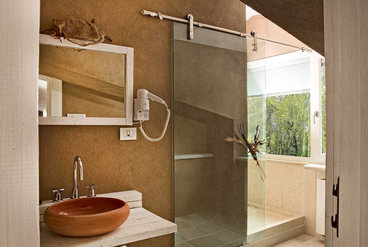 A rendere ancora più speciale questa camera, oltre al caratteristico tetto a mansarda che sembra rievocare gli antichi granai, una splendida doccia con finestra che dà sulla collina prospiciente il lago. Dettagli personalizzati come il forcone della maniglia della doccia e gli