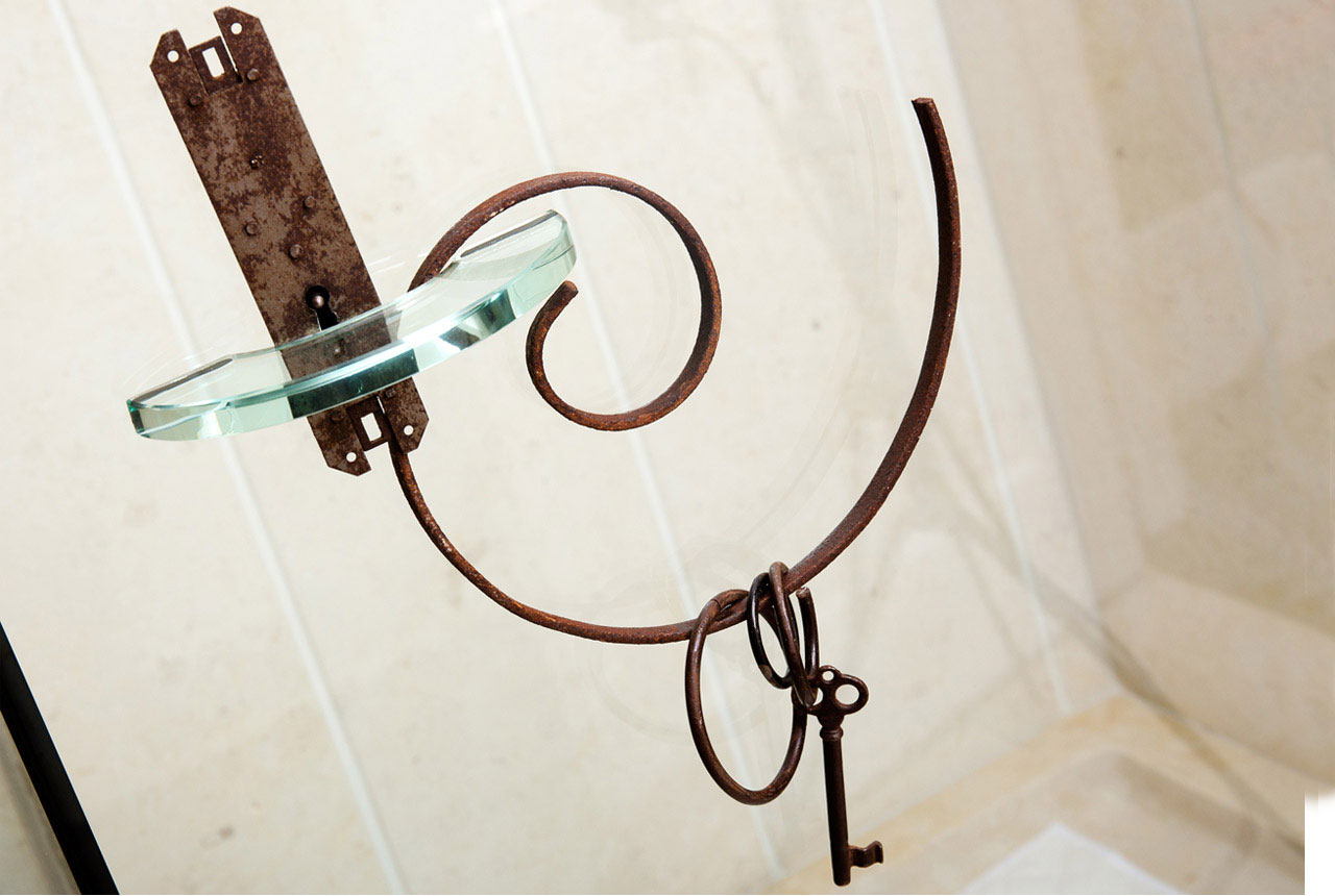 Il sapiente processo di rielaborazione dei materiali che ha accompagnato la creazione di tutti gli elementi d’arredo delle stanze della Pampa Relais è evidente anche in camere come quella del Fabbro. Antiche serrature, chiavi, maniglie, e pezzi unici forgiati dalle mani di esperti artigiani, come l’antico chiavistello in ferro battuto che funge da pomello della doccia, animano infatti un ambiente particolarissimo che culmina in una testiera del letto costituita da due antichi battenti di legno.